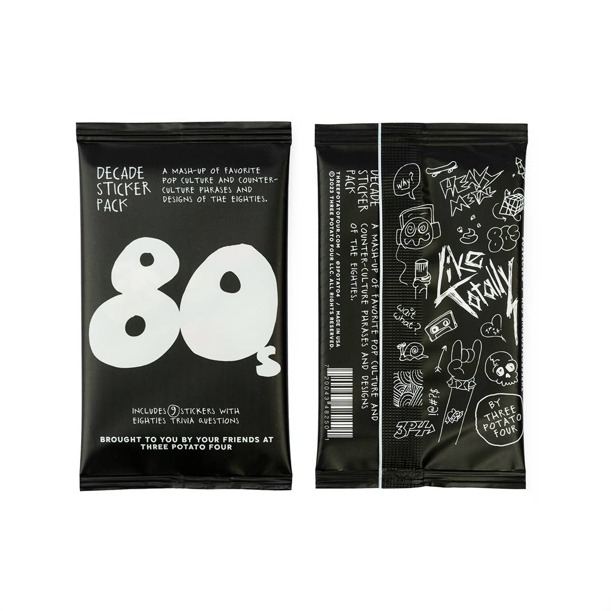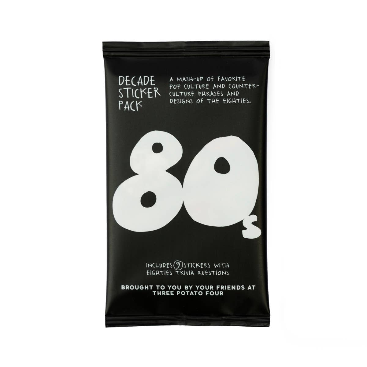 Introducing our Decade Sticker Packs - a healthy dose of nostalgia featuring iconic pop culture and counter-culture from the past four decades. Each foil pack is a curated time capsule filled with 9 sticker cards that mash-up graphics with slang words and phrases from the 1970s, 1980s, 1990s, and 2000s. Plus, don't miss the decade-specific trivia questions on the flip side of each card.