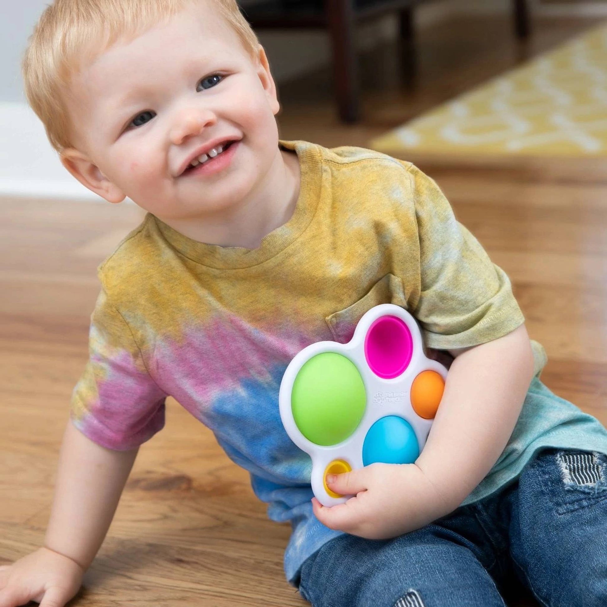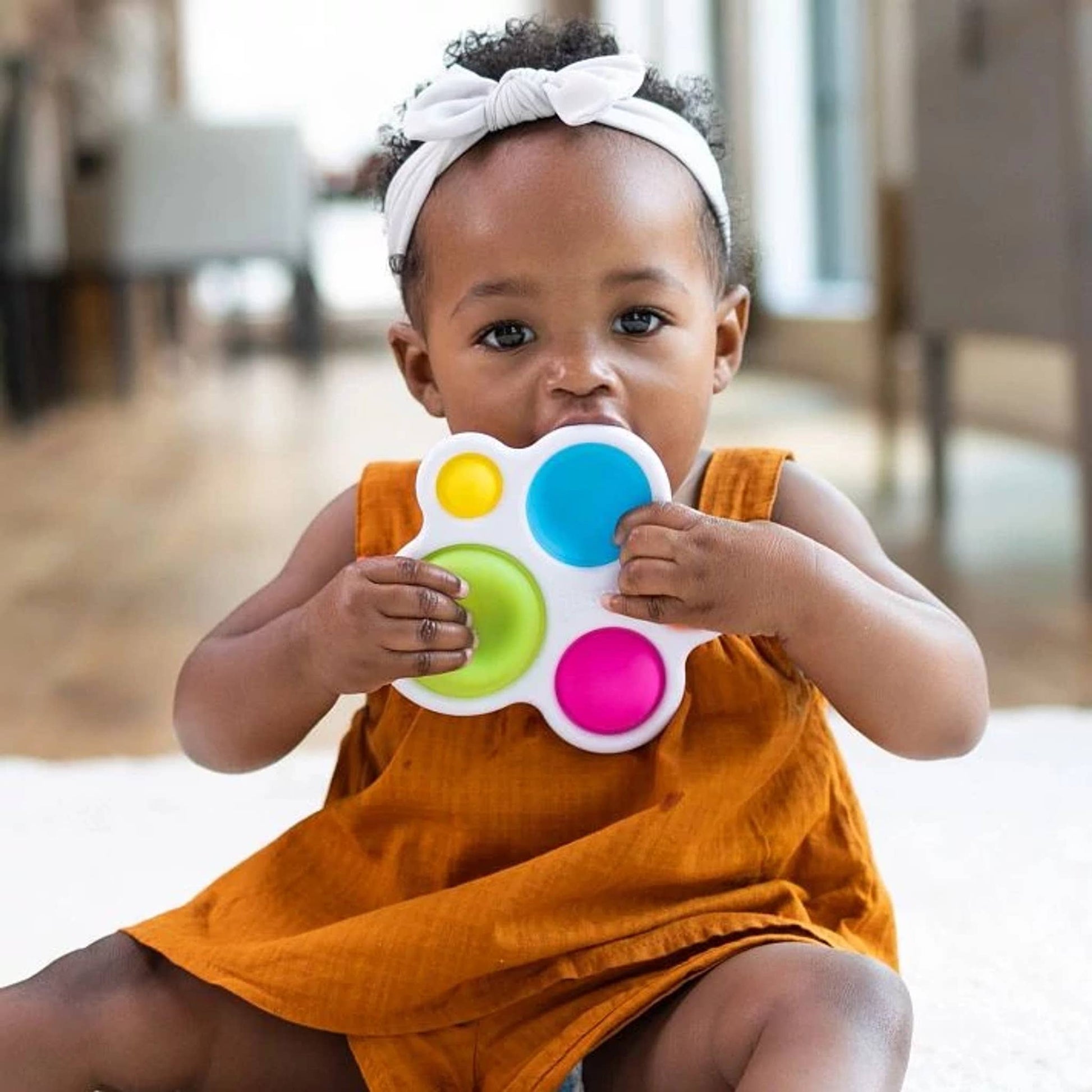 Little fingers can't resist these beautiful buttons! Built safely into the sturdy ABS plastic frame are five vibrant silicone bubbles in varying sizes and colors. It's so simple, yet oddly, so brilliantly fun, fascinating, and impossible to put down...for babies...or adults! Push them all the way in to pop them through to the other side. Delve into the simple delight of poking them with your fingers. It's a perfect sensory adventure babies and toddlers can take with them everywhere they go! (Not to mention, it's also a great decoy for staving off your grandma's cheek-grabbing fingers...) Inspire loads of giggles and hours of sensory exploration with the adorable, playful, and wonderfully durable Dimpl sensory toy.