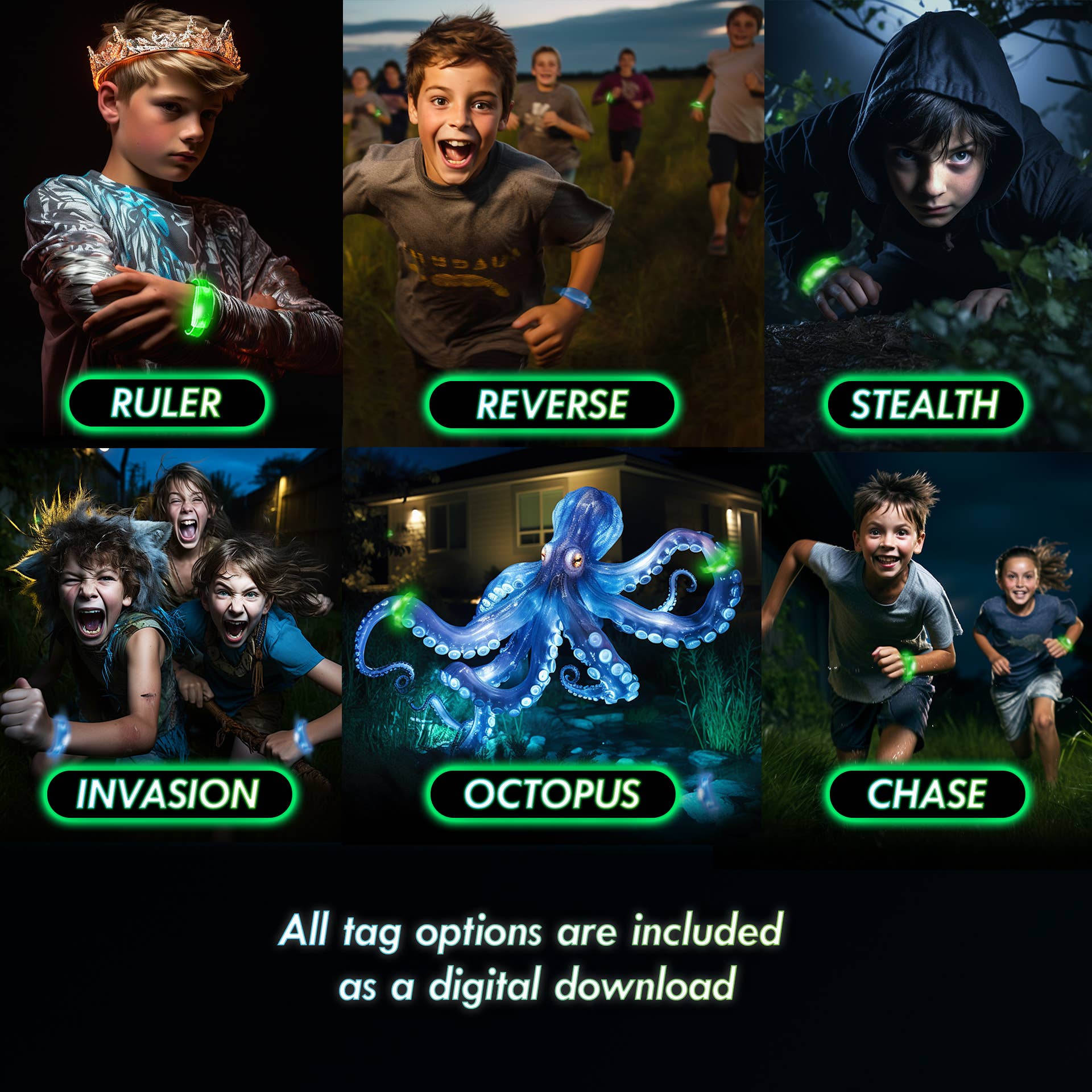 Transform the classic game of tag into a glowing spectacle! This set includes 12 unique tag variants, with both well know options (like Zombie Tag) and lesser know versions ("Octo-tag"). The 12 included bracelets also work for glow in the dark sports and as safety lights. The bracelets are equipped with adjustable bands and long-lasting batteries, suitable for intense and repeated use. For 3-24+ players, ages 5+