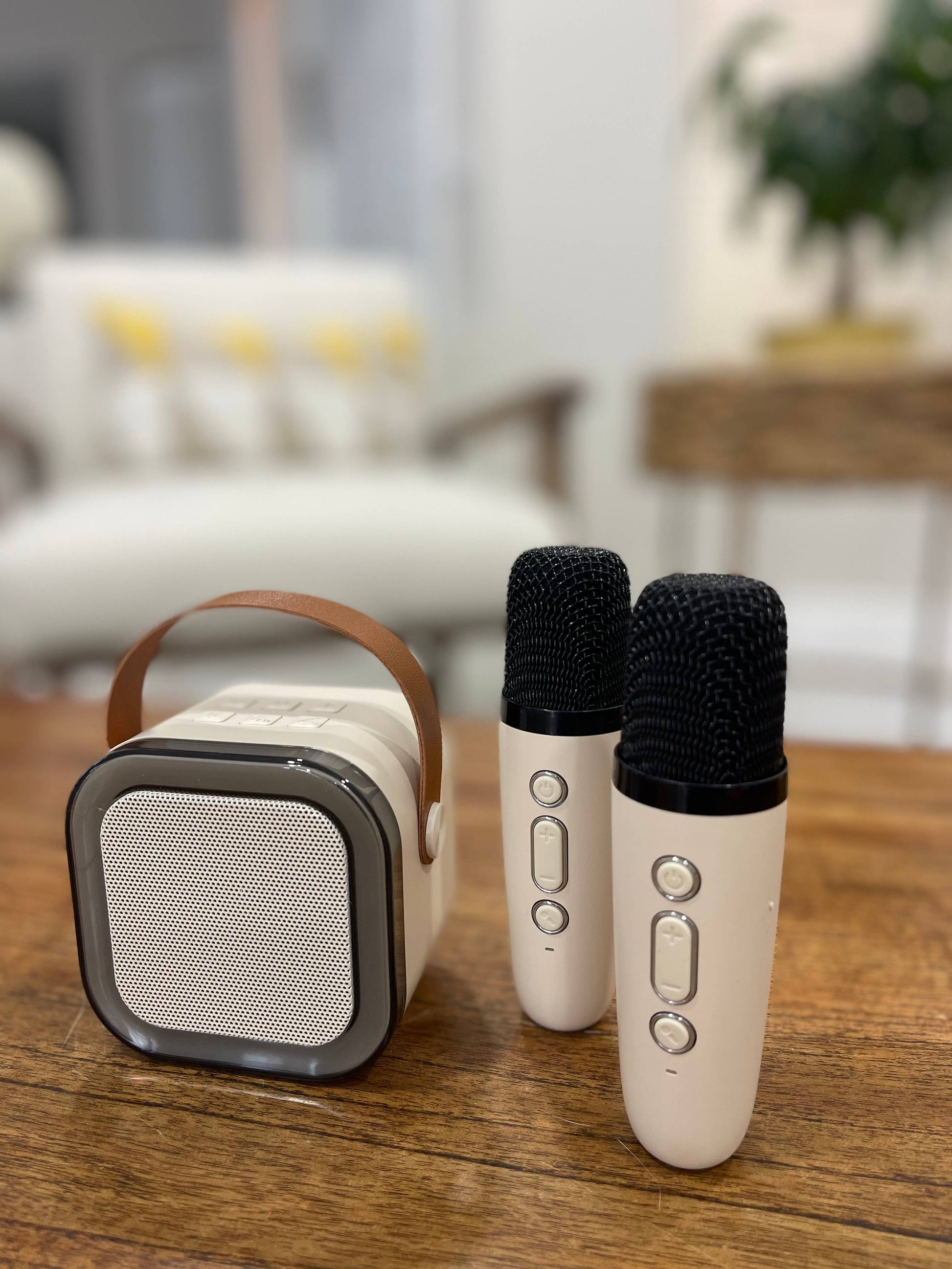 Mini Karaoke Set With LED Lights Beige Unleash your inner rockstar with our Mini Karaoke Set. This set packs all the fun of a karaoke night into a portable and easy-to-use package. The set includes a sleek microphone and a pocket-sized karaoke machine. Simple to use, Connect the Mini Karaoke Set to your favorite devices via Bluetooth and let the music play. The adjustable echo effect adds a professional touch to your vocals, ensuring an immersive karaoke experience. Perfect for parties, gatherings, or solo performances, this Mini Karaoke Set is your ticket to endless musical enjoyment. Let the spotlight shine on you, and turn any space into your own private karaoke stage with this convenient and entertaining set. Comes in Blue and violet, no more pink or cream.