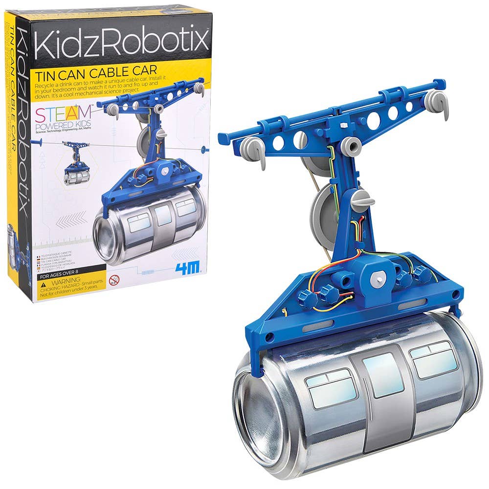 Use a recycled can to build this KidzRobotix - Tin Can Cable Car that travels back and forth on a wire. Can not included. Requires 2 x AAA batteries. Each piece is in a colored box. 6.5 x 9.4 x 2.4 inches. 6-piece order minimum.