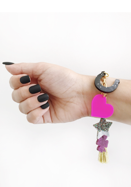 You asked and we answered. Our first bracelet is here! Each charm is meant to give you all the fashionable luck you need to get you through each day! A Heart, Horseshoe, Four Leaf Clover, Star, and a bright Gold Tassel!