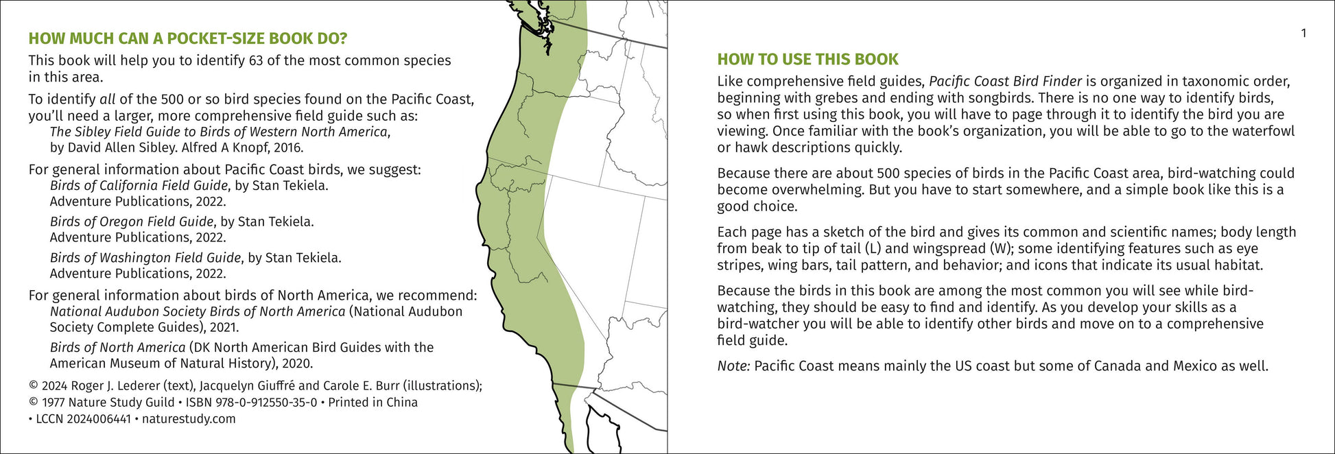 Perfect for beginning birders, the booklet introduces more than 60 of the most frequently seen species of birds along the Pacific Coast. Presented in taxonomic order, each entry includes such helpful information as size, distinguishing features, habitat, and behavior. Plus, illustrations by Jacquelyn Giuffre and Carol E. Burr help with positive identification. This guide is applicable to the Pacific Coast states of California, Oregon, and Washington.