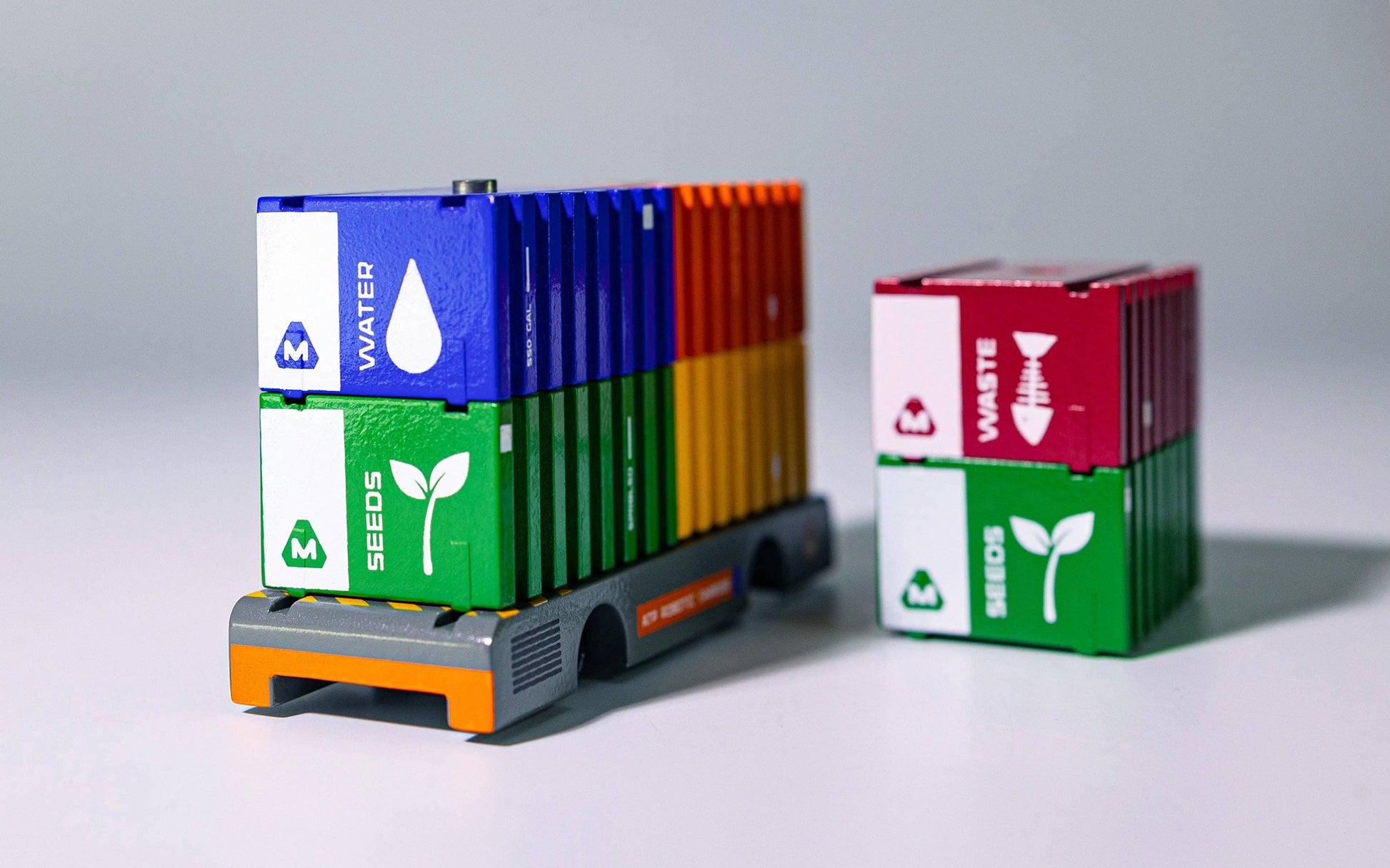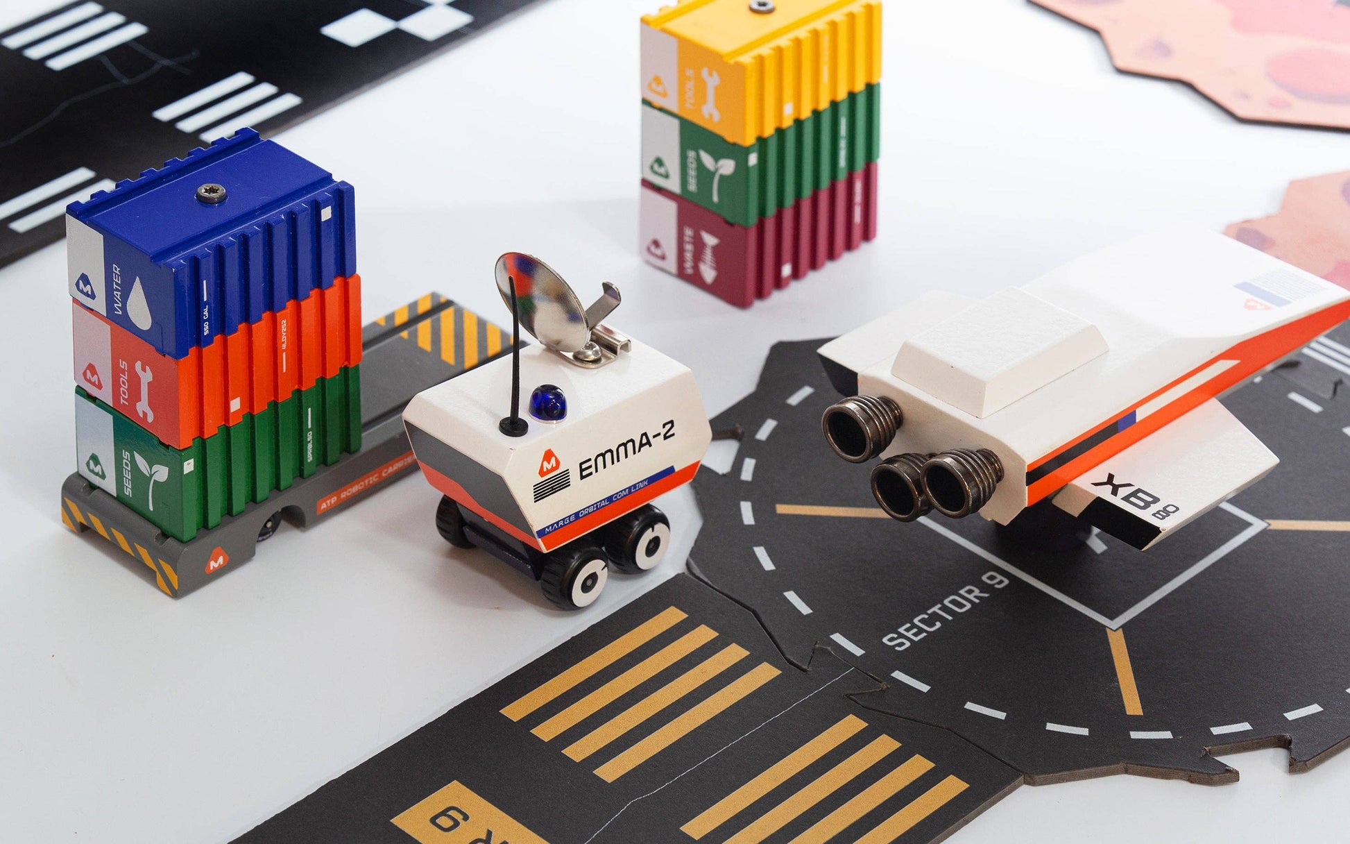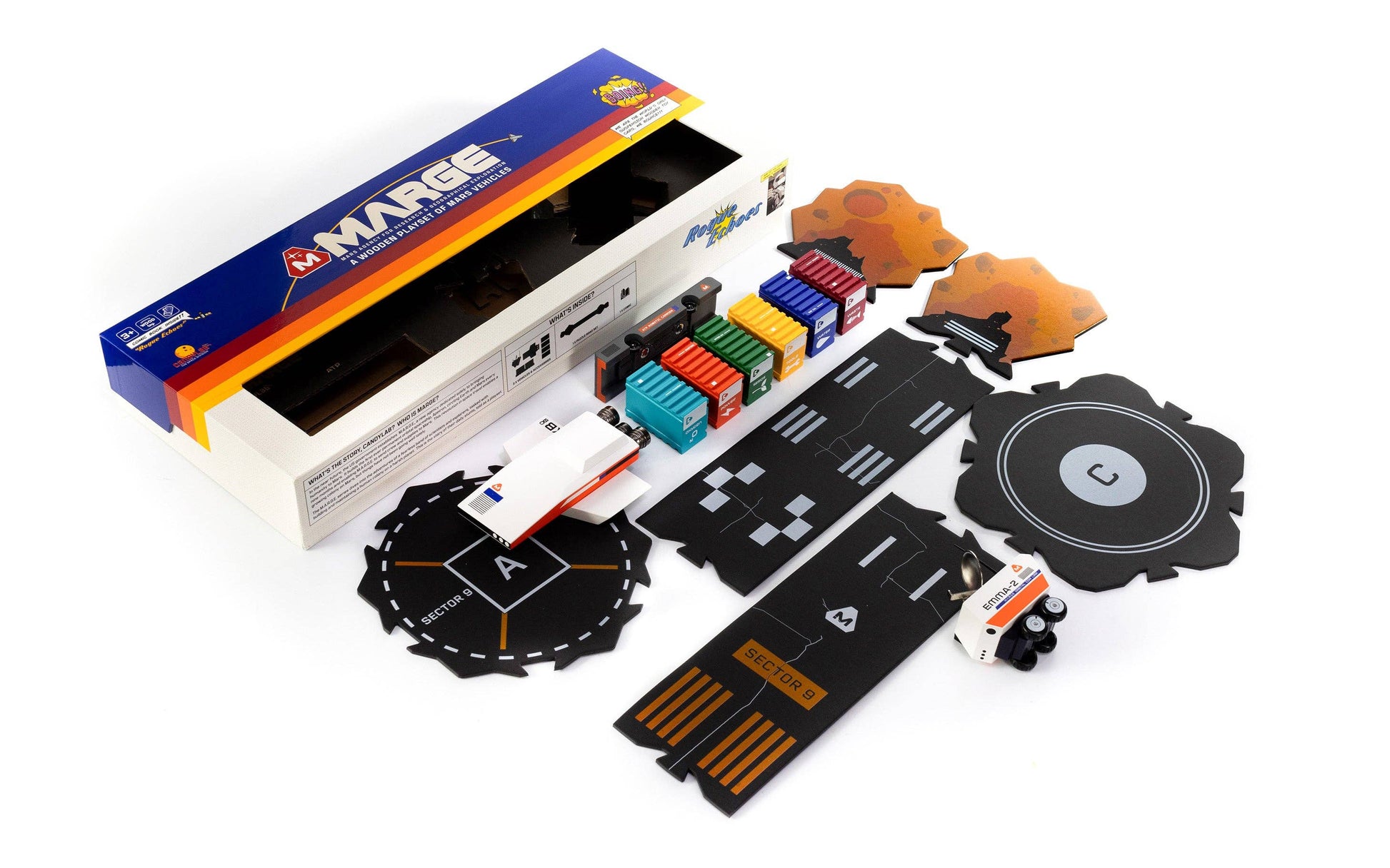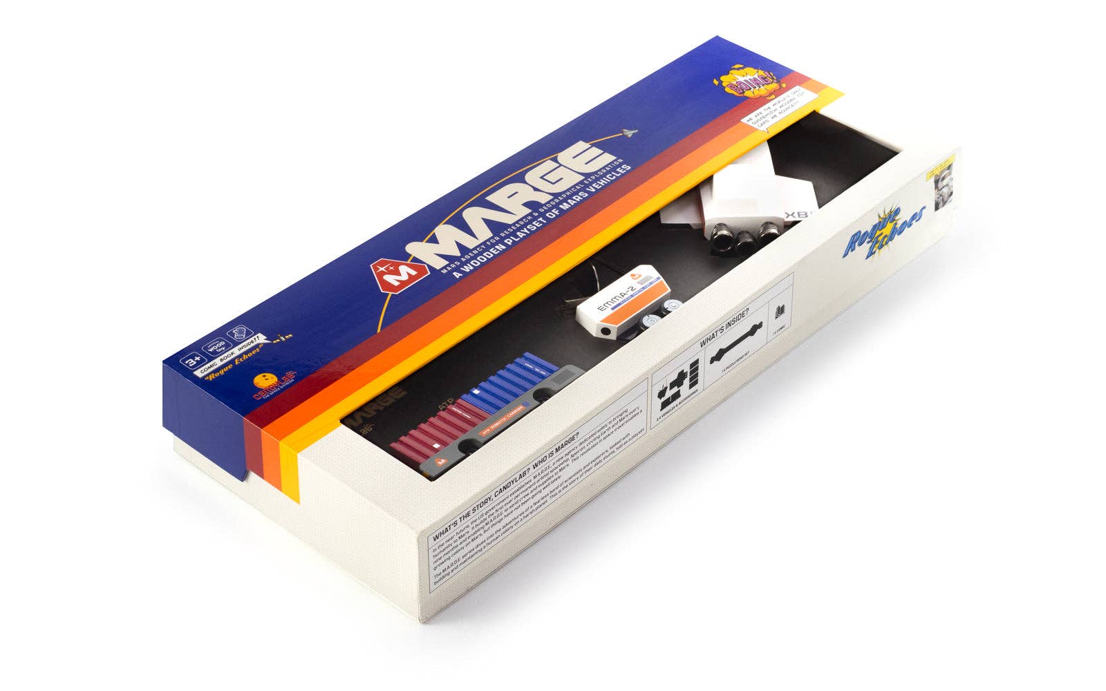 The Rogue Echoes play set includes a hi-tech trio of AI-powered vehicles. The box play set includes the EMMA-2 comms vehicle with a suspension base, the XB Shuttle with metal propulsion engines, the ATP with 6 assorted supply containers, puzzle roads, and the Rogue Echoes comic book.