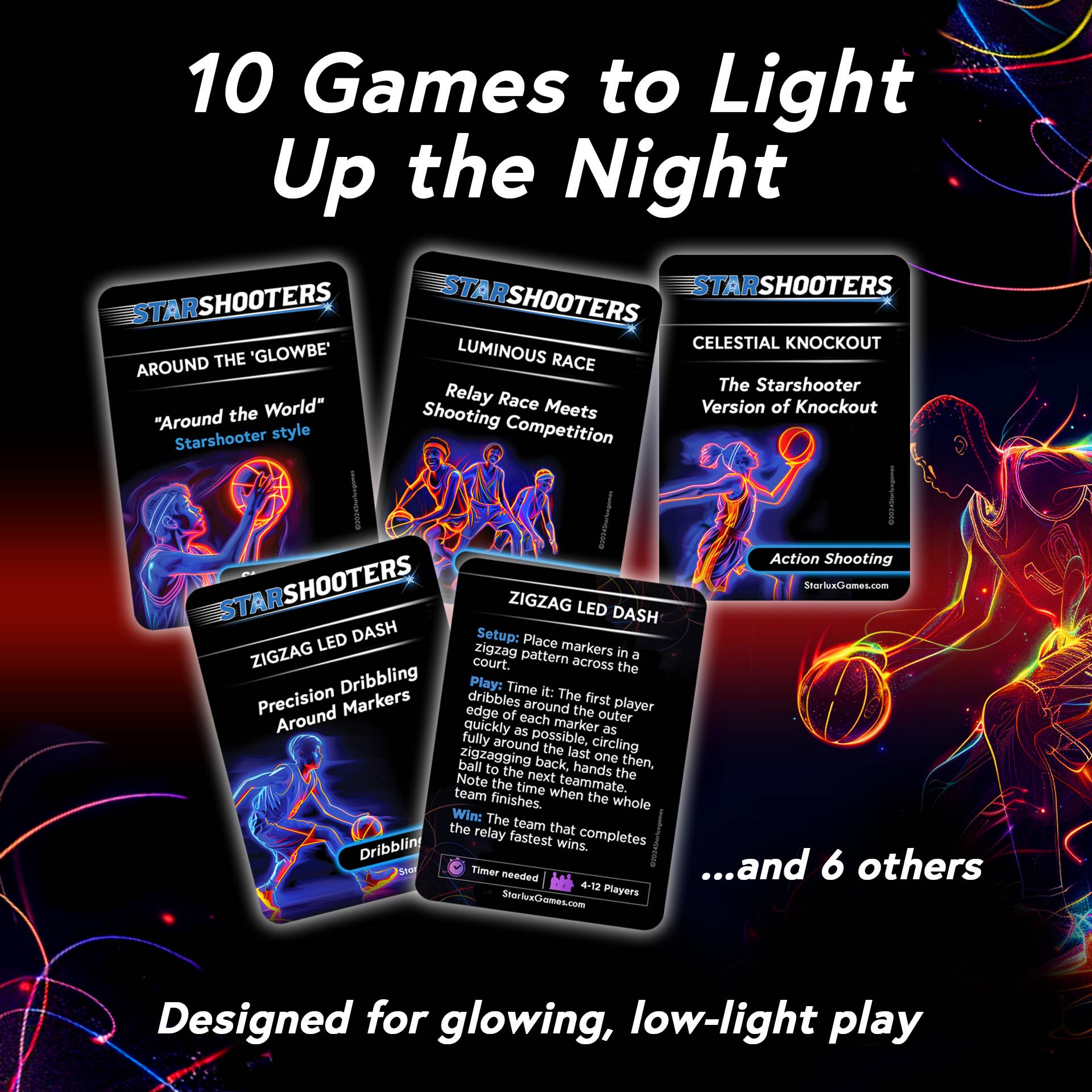 Transform evening basketball games into a glowing court of lights with StarShooters! This basketball game set offers a rechargeable LED basketball, pump, inflation needle, USB cable, six light up markers and 10 game cards that outline dynamic, low-light competitions. From speed relays to team shooting challenges, these games light up nighttime basketball in dazzling new ways.
