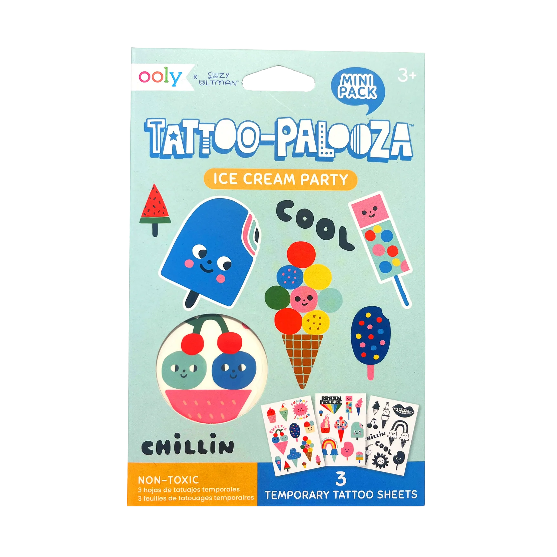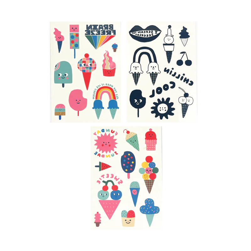These treats are sweet and they won’t cause a brain freeze! Sprinkle these temporary tattoos for kids on your arm and we guarantee you’ll look deliciously fashionable. Designed by the illustrator and toy creator, Suzy Ultman, this mini-pack of three tattoo sheets features a delectable ice cream theme. Non-toxic and designed with poppy, vibrant colors or sleek black and white, these are wearable kids' art. These kids tattoos are perfect for dressing up a boring afternoon or as a fun party favor!